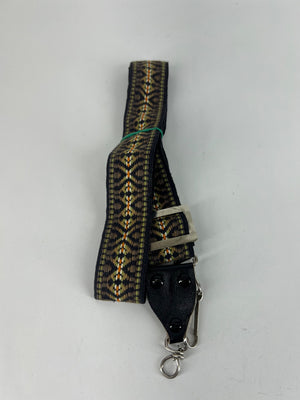Adjustable guitar strap manufactured in the USA during the 1970s. Features a woven pattern in earthy tones and includes metal hardware and leather end pieces for durability. The strap is designed for secure attachment to an instrument via metal clips. Overall condition is good with signs of use consistent with age.
