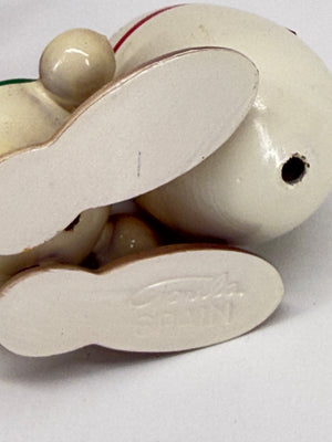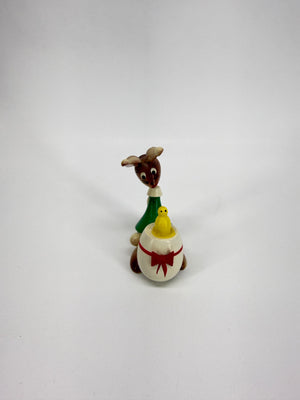 A 1960's or1970s hand-painted ceramic rabbit figurine, crafted in Spain. The design depicts a whimsical rabbit in a green outfit holding an egg adorned with a red bow featuring a yellow chick on top. Stamped with ‘Spain’ on the base. The figurine displays detailed craftsmanship and colorful accents.