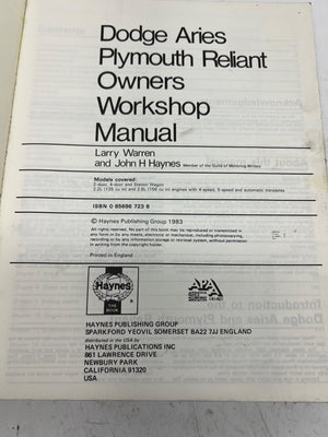 This Haynes Owners Workshop Manual for the Dodge Aries and Plymouth Reliant (1981 through 1983 models) provides thorough guidance for 2.2L and 2.6L engines, covering 2-door, 4-door, and station wagon variants. Manufactured in England, this manual offers detailed diagrams, photographs, and step-by-step troubleshooting advice for effective repairs and maintenance. Essential for collectors or enthusiasts.