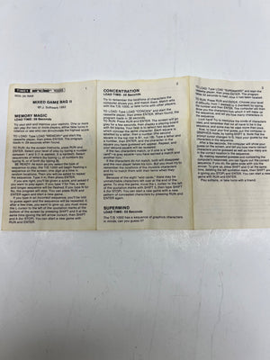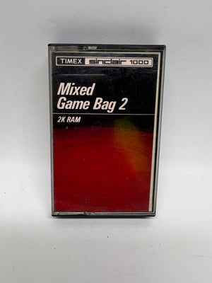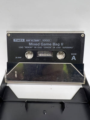 This Timex Sinclair 1000 cassette tape titled 'Mixed Game Bag 2' was manufactured in the USA in 1982. Designed for the Sinclair 1000 computer, this cassette contains interactive software, including games like 'Memory Match,' 'Concentration,' and 'Supermind.' It is accompanied by detailed instructions, offering insight into the era's programming and gaming culture.