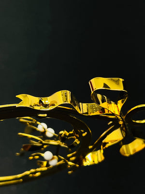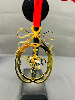 Gold Christmas ornament with mistletoe design on a red ribbon against a gray background
