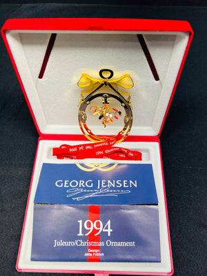 1994 Georg Jensen Christmas ornament featuring a gold-tone mistletoe design with red ribbon for hanging. Designed by John Frick, this piece comes in its original box with documentation. The ornament is in excellent condition with no visible damage, embodying a classic holiday aesthetic.