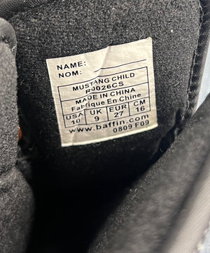 -40 Baffin Mustang Child boot liners in size 10, designed for temperatures as low as -40 degrees. Fabricated in China, featuring a black mesh exterior and insulated interiors for warmth. Label marked as style R0026CS, color black, and AAA dimension. Intended for children’s boots. Item in used condition with visible wear.