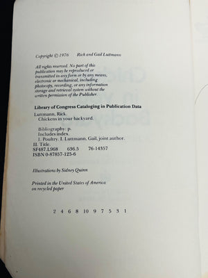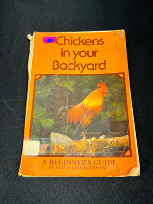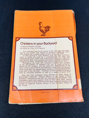 Paperback book titled ‘Chickens in Your Backyard: A Beginner’s Guide’ by Rick and Gail Luttmann, published in 1976. Includes practical guidance on raising chickens with illustrations by Sidney Quinn. Printed in the United States. The book shows visible wear, including creases and some damage on the cover and spine.