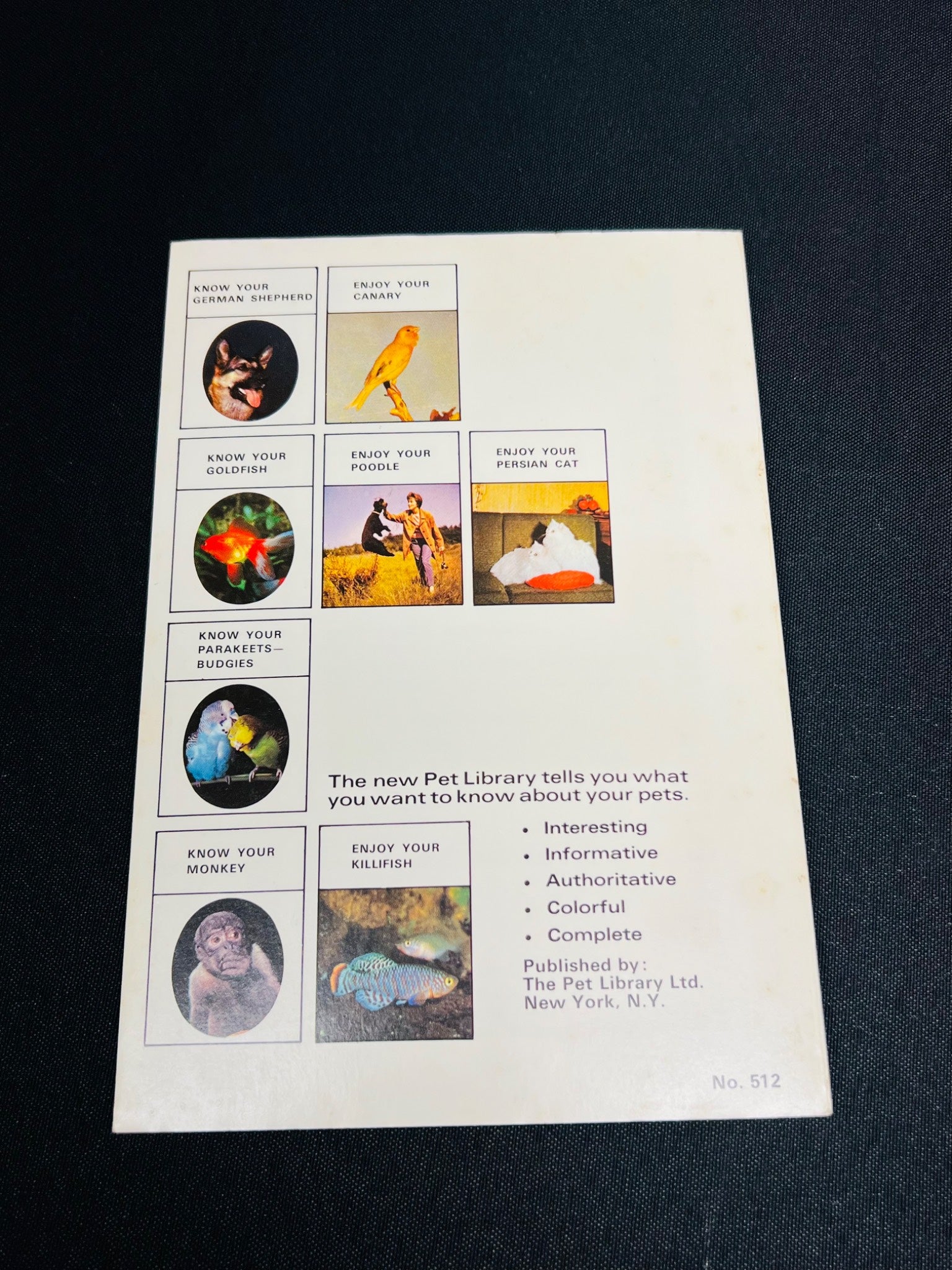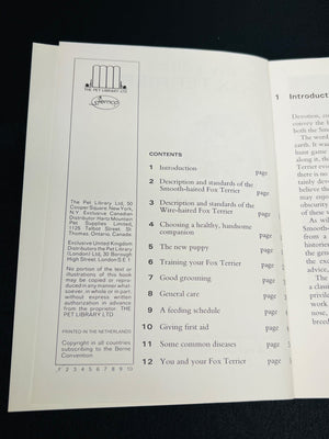 Pet Library publication titled ‘Know Your Fox Terrier.’ Features detailed information about caring for, training, and understanding Fox Terriers, including sections on feeding schedules, grooming, and health maintenance. Paperback format with 12 pages detailing breed standards and care tips. Published by The Pet Library Ltd., New York.