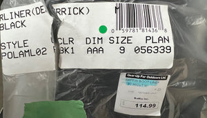 Black boot liners marked as size AAA 9, style POLAM02 PBK1. Features a textured outer material with reinforced heel and toe areas. Original retail tag indicates a price of $103.99. Includes original packaging with manufacturer details.