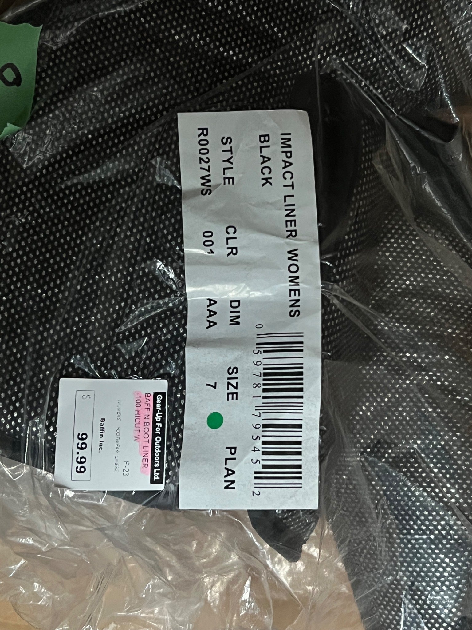 Women’s Black High cut Impact Liner Boots in size 7. Model R002WM5, style AAA, color black. Designed for additional comfort and impact resistance. Unused condition with original packaging as shown. Suitable for specific footwear or activities requiring protection.