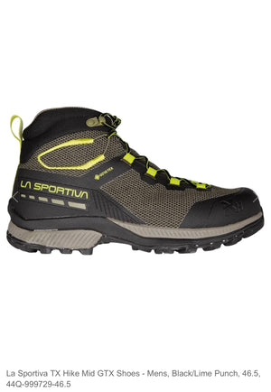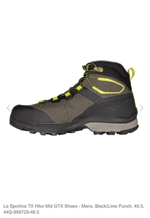 La Sportiva TX Hike Mid GTX hiking boots for men in black and lime punch, size 46.5 (US size 10.5). Features Gore-Tex lining for waterproof breathability, Vibram outsole for excellent traction, and mid-cut design for ankle support. Lightweight yet durable, ideal for hiking and outdoor activities.