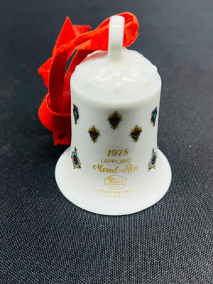 1978 Hutschenreuther Christmas Bell titled ‘Weihnachtsglocke 78,’ featuring ‘Christmas in Lapland’ motif. Crafted from fine porcelain with vibrant illustrations of reindeer and a winter scene, adorned with a red ribbon for hanging. Includes original box. Limited edition collectible in excellent condition.