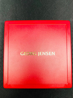 Georg Jensen 2004 Christmas ornament featuring a gold-plated design with intricate holiday motifs, including trees and a sleigh. Includes original red ribbon, box, and documentation. Marked “Georg Jensen” and “2004”. Preserved in excellent condition with all original packaging.