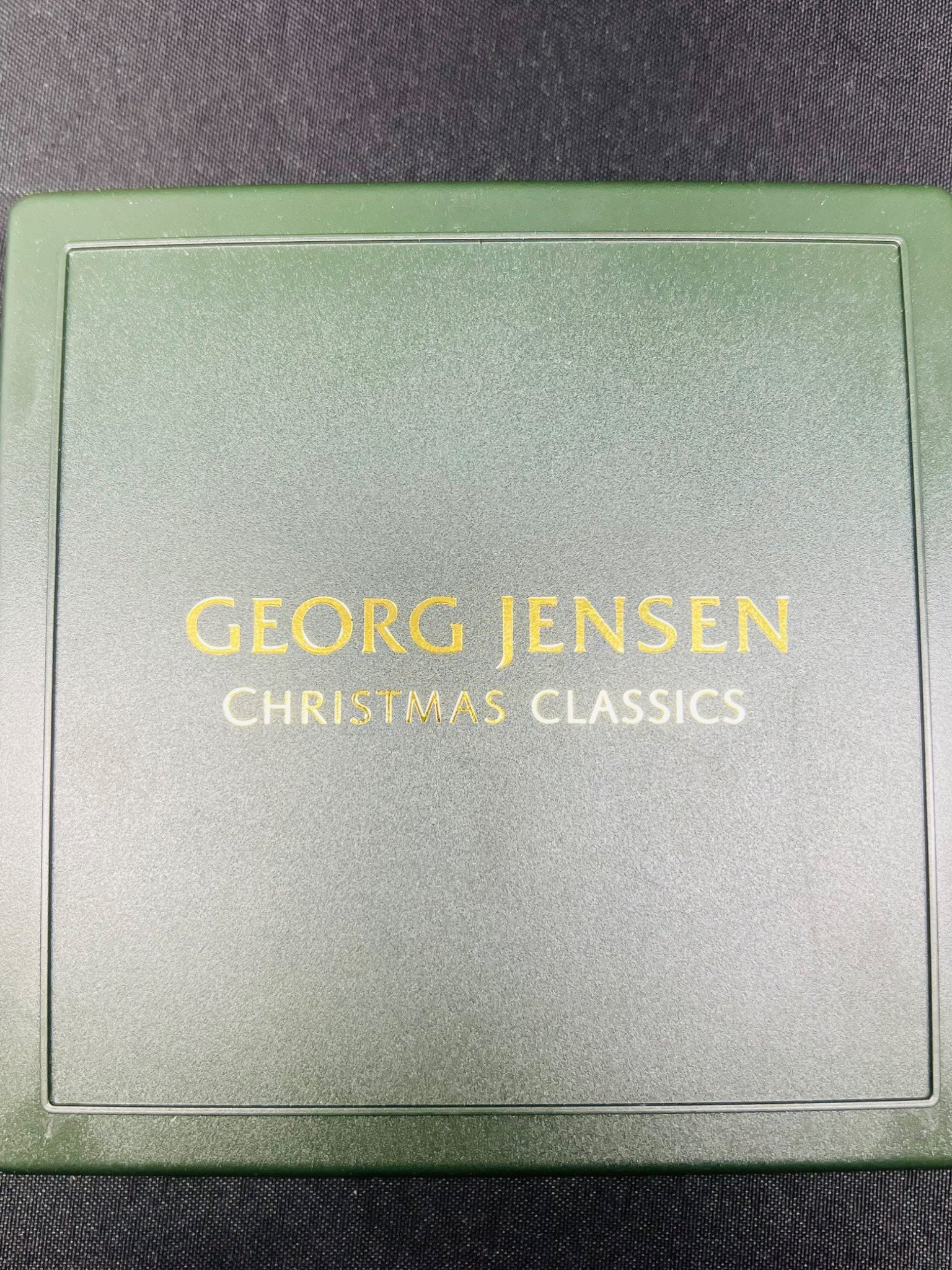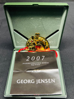 Gold-plated Georg Jensen Christmas Snowman from 2007, designed by Ole Kortzau. Features a festive motif with a snowman, heart, tree, and presents. Includes original presentation box and booklet. Marked ‘Georg Jensen Denmark,’ ensuring authenticity. A collectible holiday ornament from the Christmas Classics series.