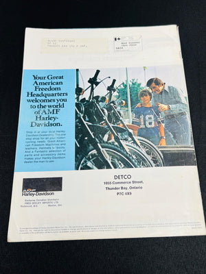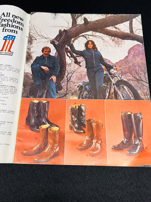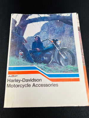 An original 1970s Harley-Davidson Motorcycle Accessories catalog by AMF. Features a variety of motorcycle-related products, including apparel, boots, and other accessories. Contains full-color imagery and product descriptions. Condition shows minor wear on the cover and pages consistent with age. A collectible for Harley-Davidson enthusiasts.