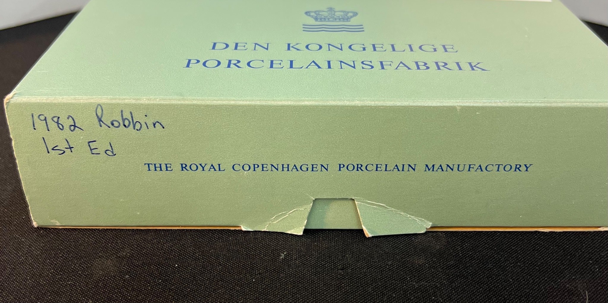 1982 Royal Copenhagen porcelain collector plate titled 'Mother Robin with Babies,' first edition. Designed by Sven Vestergaard. The plate showcases a blue-on-white depiction of a robin and chicks, surrounded by floral details. Approximately 7 inches in diameter and includes the original box. Marked on the back with maker's logo and details.