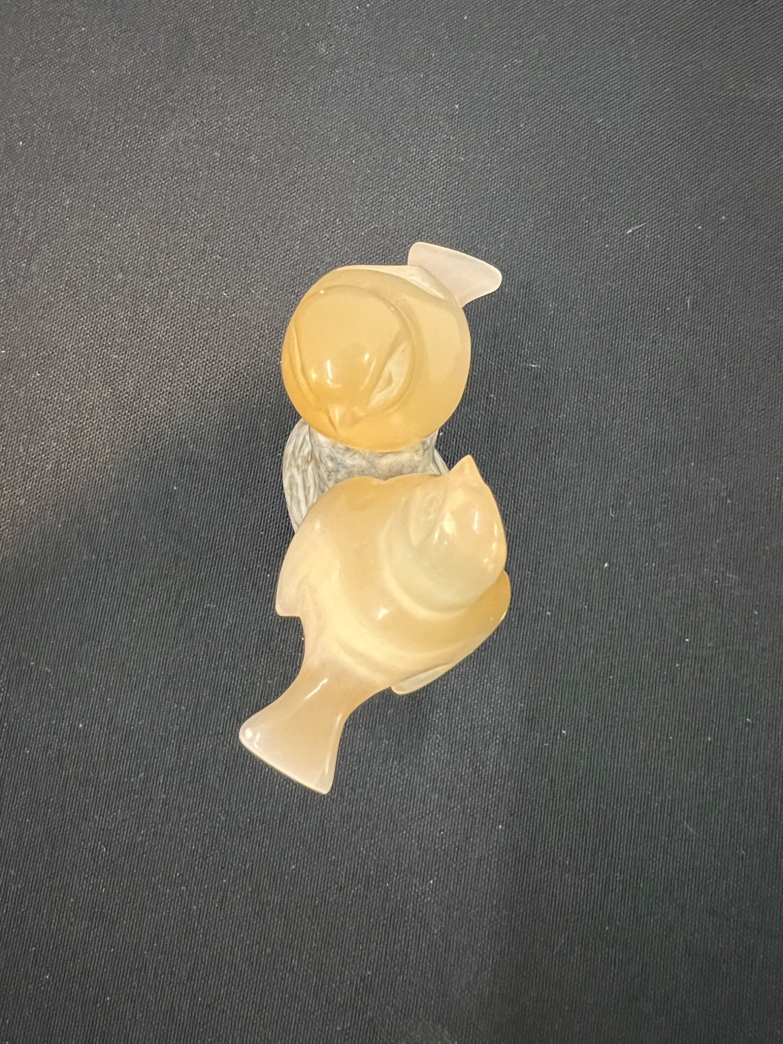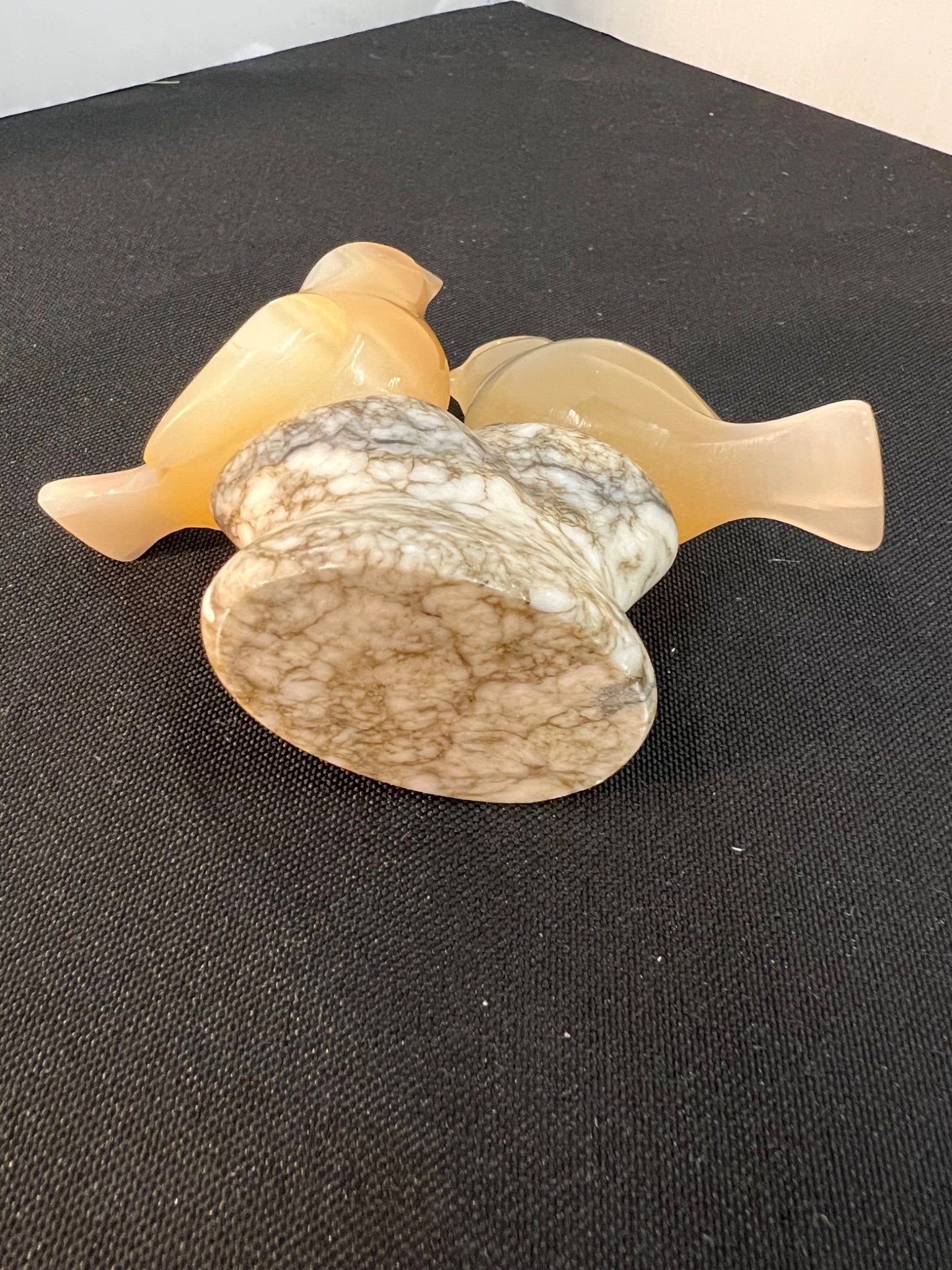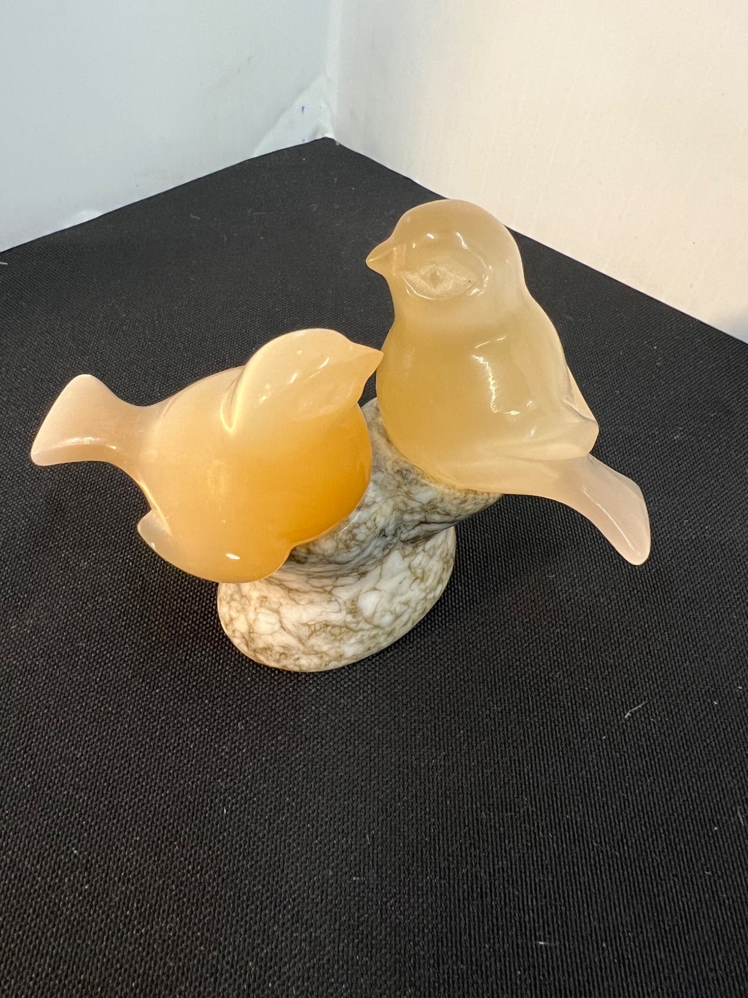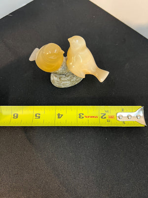 Carved onyx figures of two birds perched on a veined marble base. The birds are crafted in shades of yellow and orange, adding a naturalistic tone. The base features a smooth marbled design, complementing the figures. Measures approximately 3 inches in height, with a length of around 4 inches.