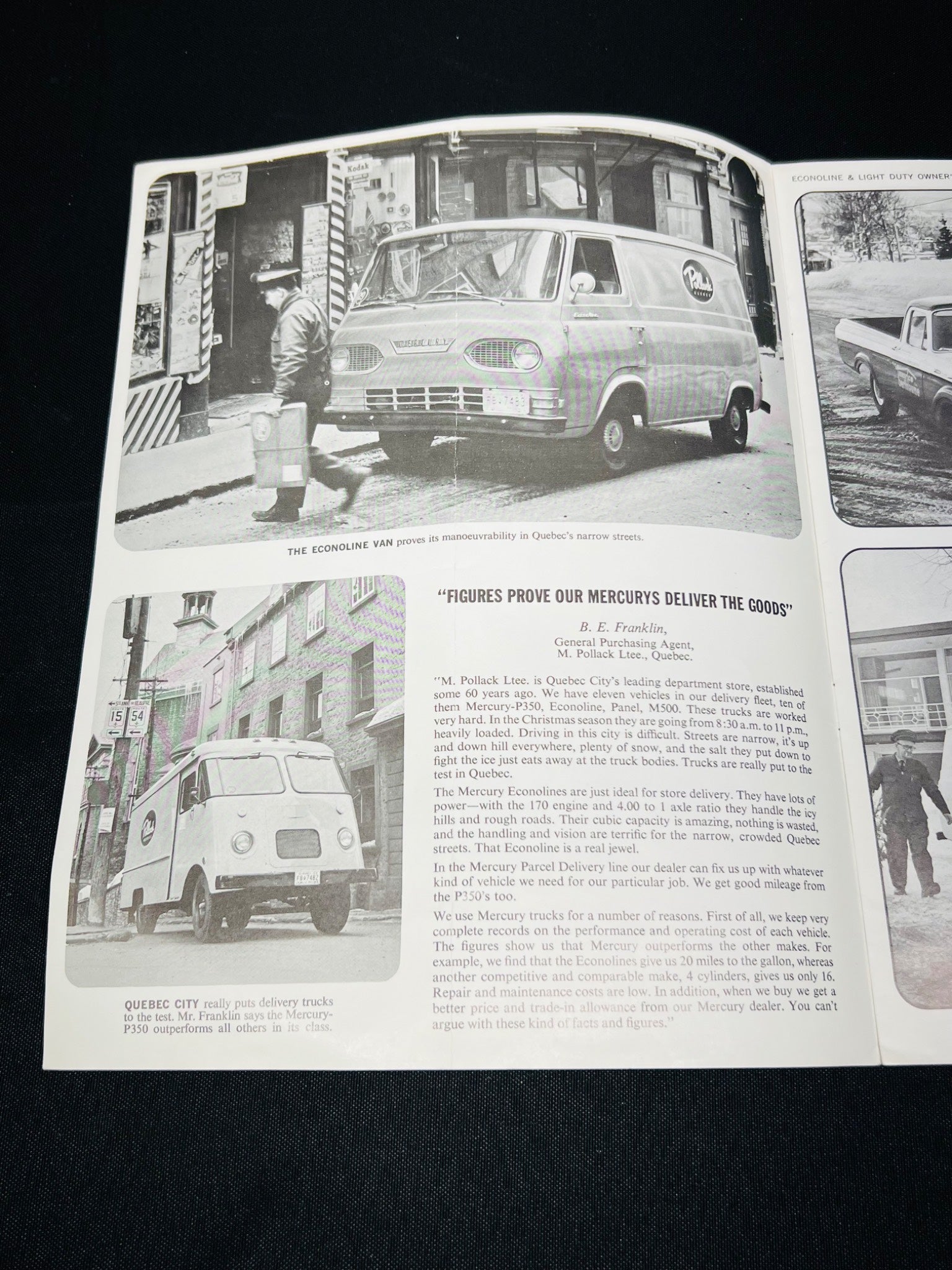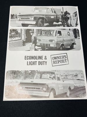 Original Ford Econoline & Light Duty owner’s report brochure featuring black-and-white imagery and descriptions of early Ford models. Includes promotional content showcasing Ford’s utility vehicles and testimonials from owners. Contains multiple pages with high-quality historic photographs and Ford promotional content. Suitable for collectors of vintage automotive literature. Good overall condition.