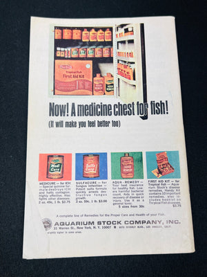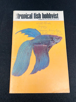 May 1967 issue of “Tropical Fish Hobbyist” magazine, featuring a colorful Betta fish on the cover. The publication contains detailed articles on the care and maintenance of tropical fish, as well as advertisements for aquarium supplies. In good vintage condition with signs of light wear consistent with age.