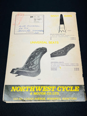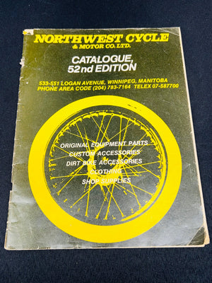 Northwest Cycle & Motor Co. Ltd. 52nd Edition Catalogue featuring original equipment parts, custom accessories, dirt bike accessories, clothing, and shop supplies. Includes illustrations, product descriptions, and pricing. Published in Winnipeg, Manitoba, Canada. Cover shows wear; internal pages appear intact.