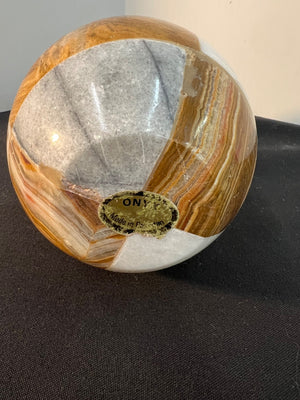 Polished decorative egg crafted from multi-colored onyx stone, featuring natural veining and a patchwork design in shades of white, brown, and gold. The egg is approximately 4 inches tall. A sticker on the base indicates it is made from onyx. Ideal for decorative display.