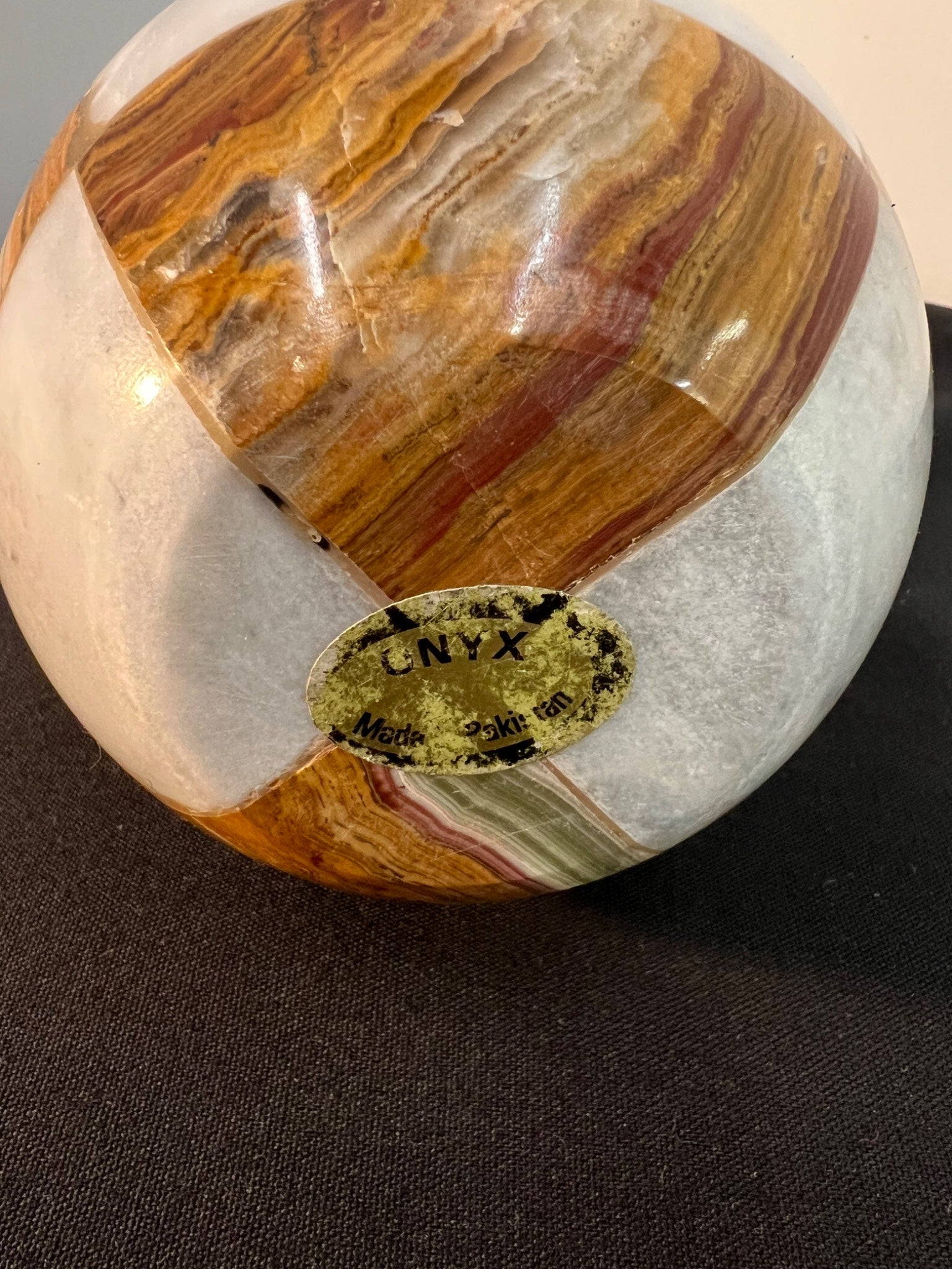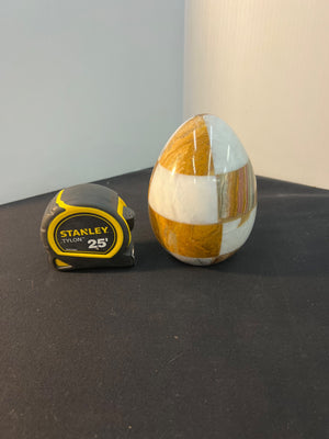 Polished onyx egg sculpture displaying a checkerboard pattern with alternating natural tones of beige, white, and earthy brown. Marked as made from onyx and measuring approximately 3 inches in height. The piece is smooth and polished, suitable for display or collection purposes.