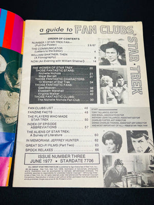 June 1977 issue of the ‘All About Star Trek Fan Clubs’ magazine. Features include an evening with William Shatner, guides to fan clubs, and articles on Star Trek women and crew members. Contains 66 pages, with photos and illustrations. Cover shows minor wear consistent with age.