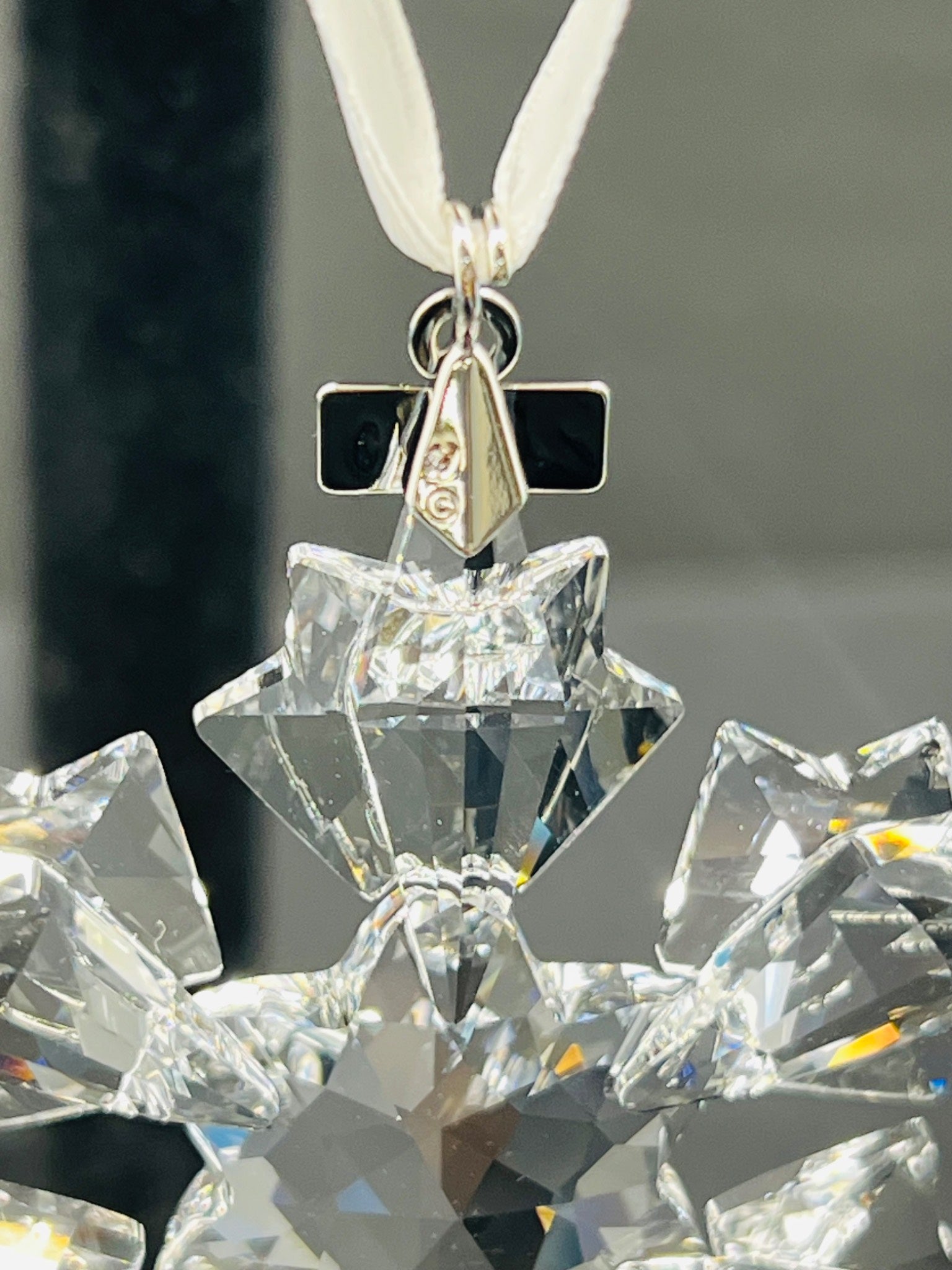 Crystal snowflake ornament with '2016' on a white ribbon against a gray background