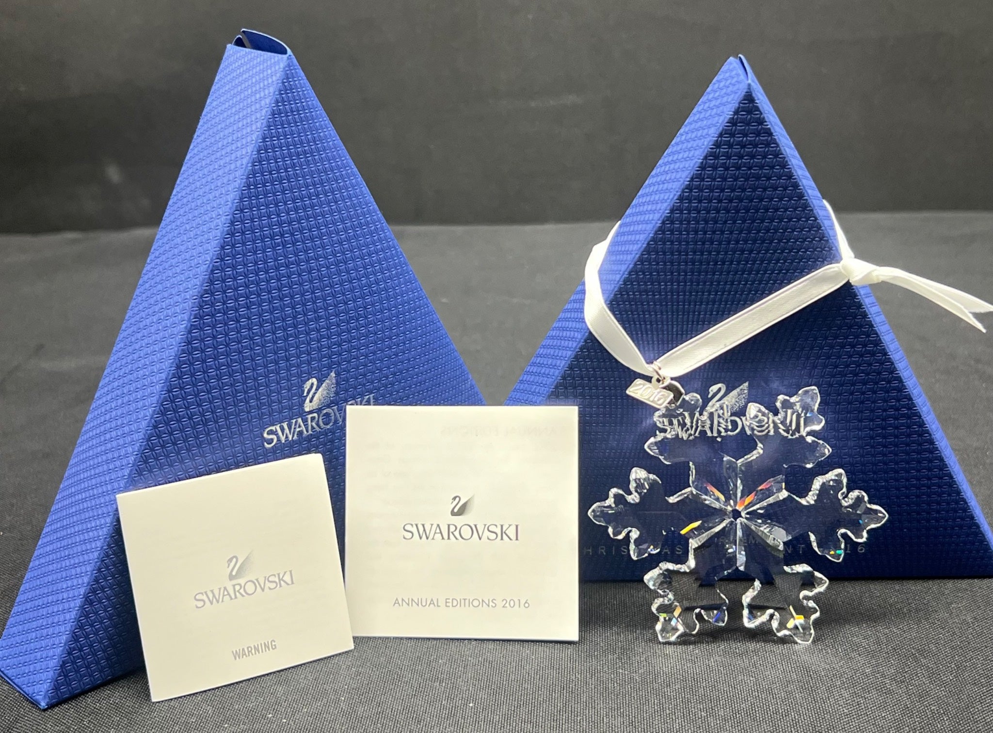 Swarovski 2016 annual edition snowflake ornament crafted from faceted crystal. It features a central snowflake design with a 2016 metal tag and a white ribbon for hanging. Includes the original blue triangular box and documentation. Made in Austria. Excellent condition.