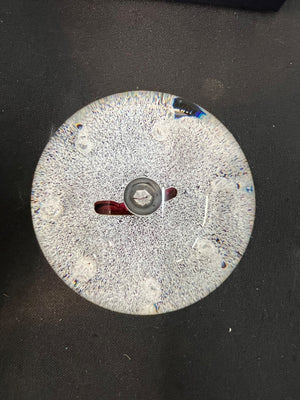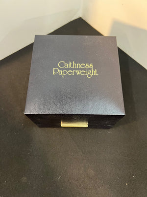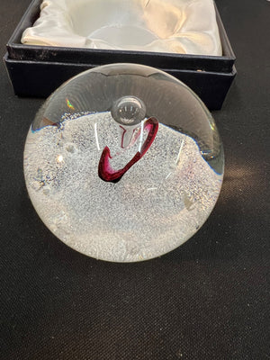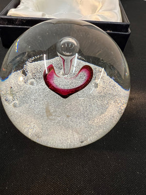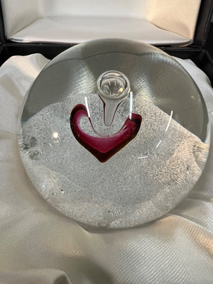 Caithness paperweight featuring a clear glass design with a suspended red heart-shaped motif and bubble detail. Includes the original presentation box with silk lining and the Caithness branding. Excellent condition with no visible chips or damage.