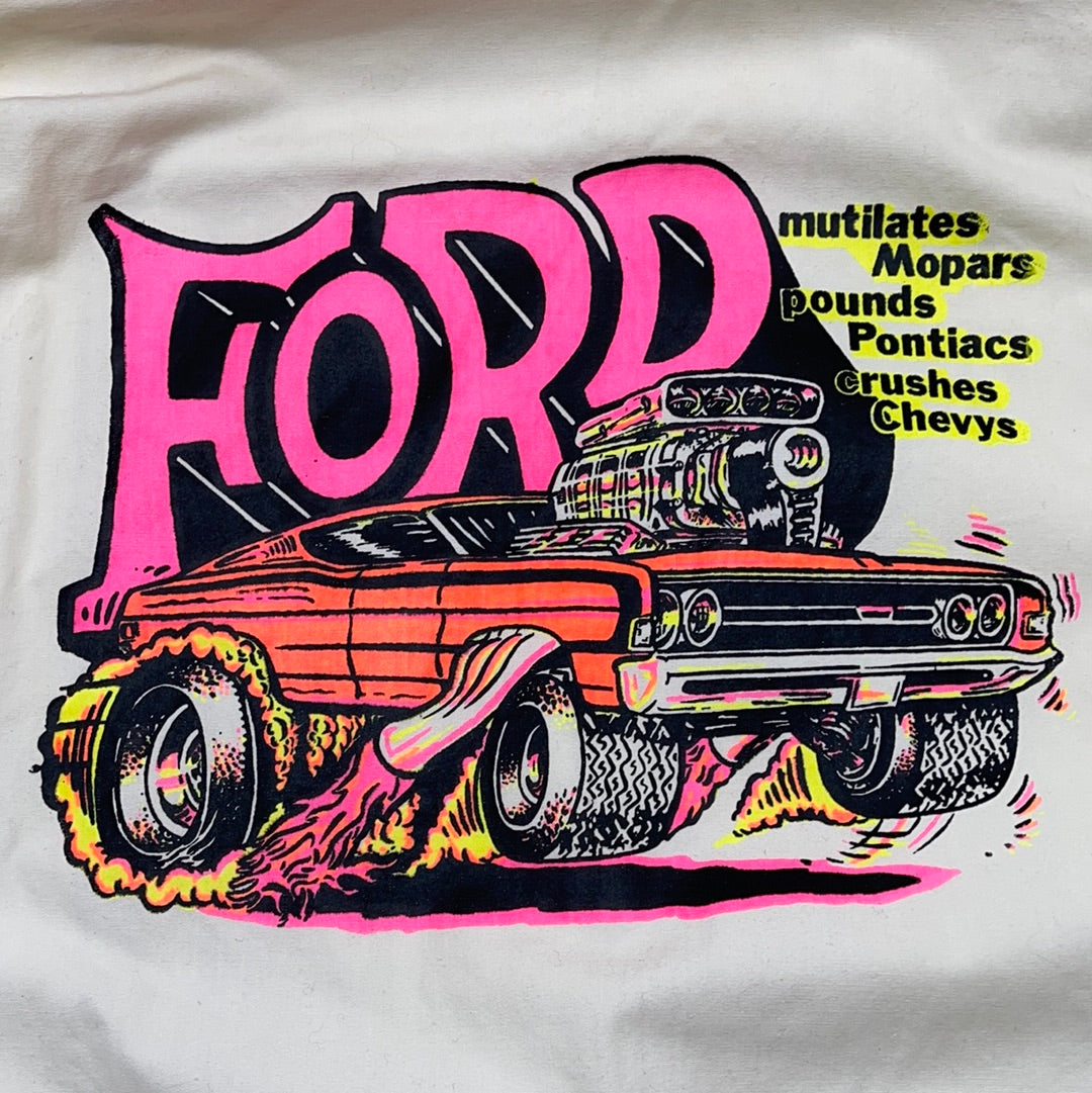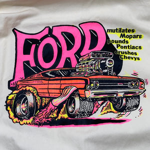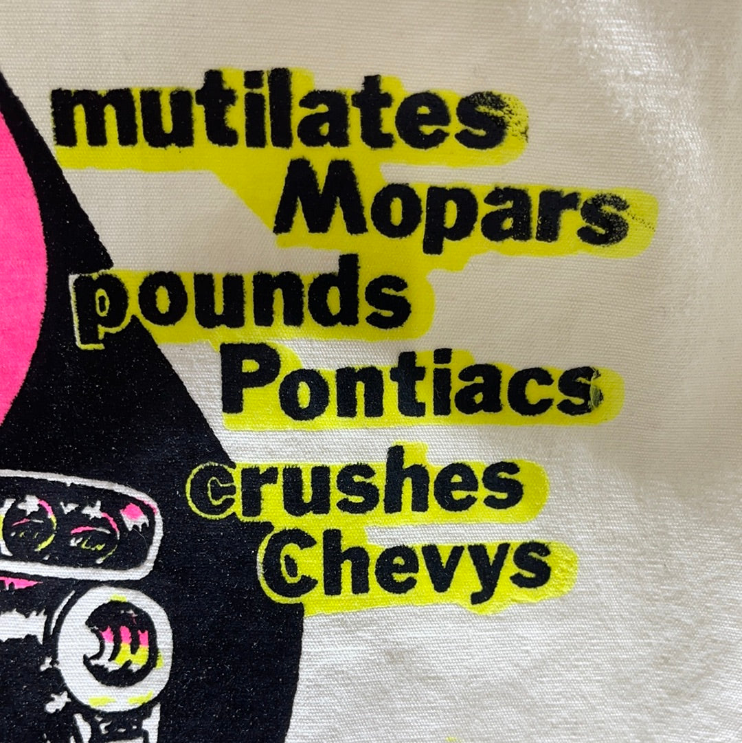 The back of the jacket sports an awesome graphic with a hot rod Ford and the words mutilates Mopar‘s, hounds Pontiacs, crushers Chevys