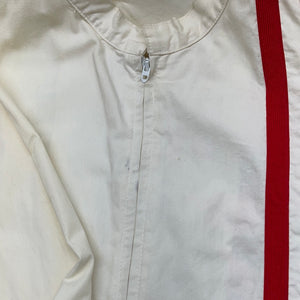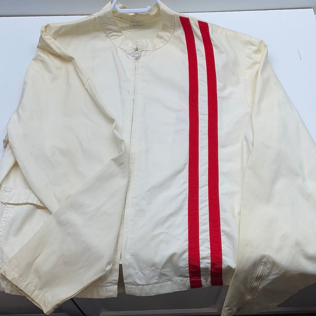 This 100% cotton made in USA Ford jacket is a zip up style with zippers on each sleeve and a small pocket on the front right. It is a men’s size large! This jacket does not appear to be worn very much if at all but does have a couple of slight stains on the inside collar and a little on the front jacket near the zipper. I have not tried to clean this jacket at all.