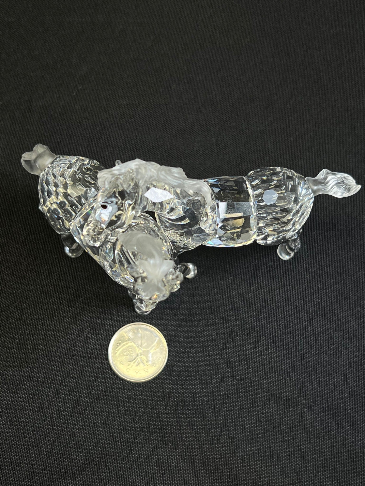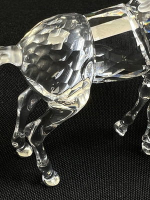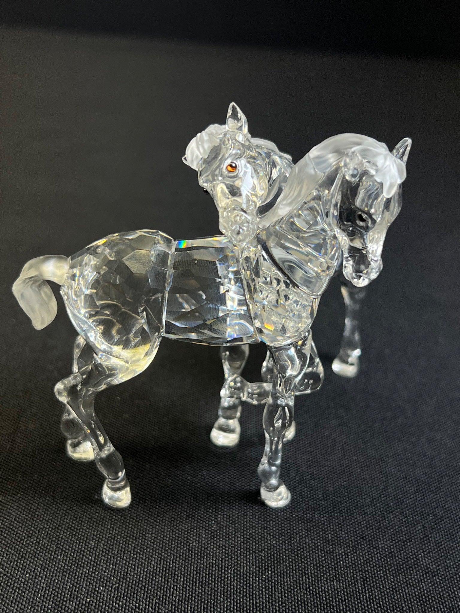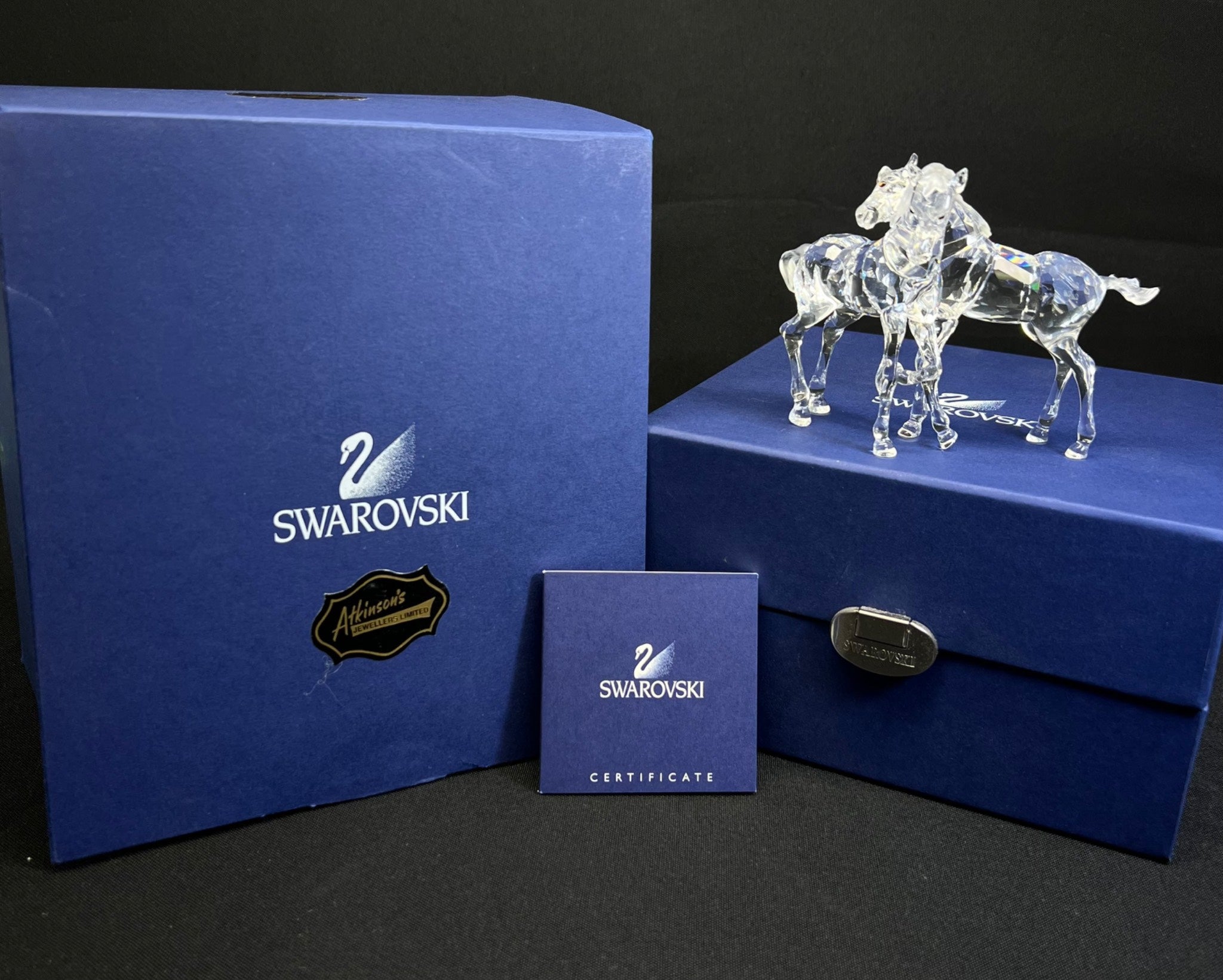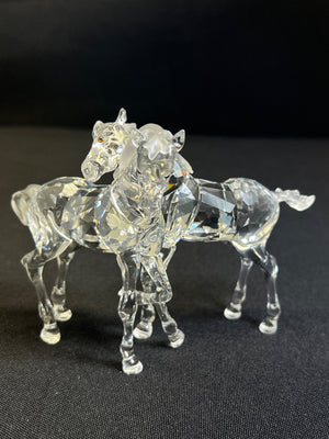 Swarovski crystal figurine showcasing two horses crafted with precision cut clear crystal. Made in Austria, this piece features intricate details and includes original box and certificate of authenticity. Ideal for collectors or as a decorative item. Model no NR 000 003