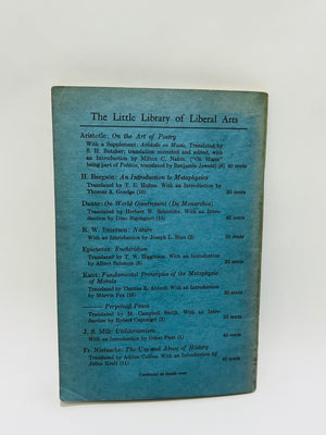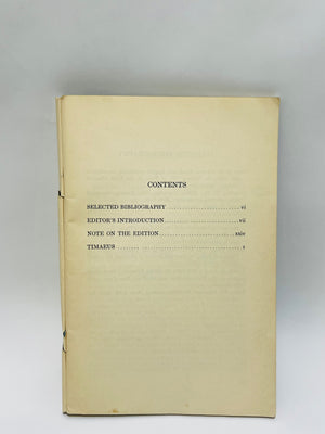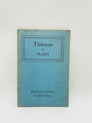 1949 'Timaeus' by Plato, part of The Little Library of Liberal Arts series, published by The Library Publishers in the United States. Blue paperback cover with black text. Includes contents, editorial introduction, note on the edition, and full text of 'Timaeus.' Measures approximately 6.5 x 4.5 inches. Some wear on the spine and edges, consistent with age.