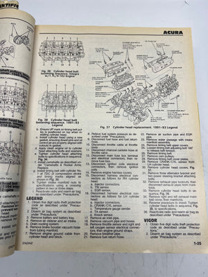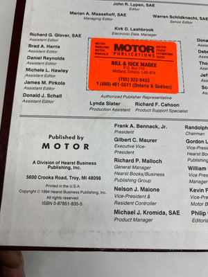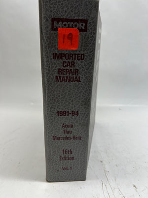 This Motor Publications car repair manual, 16th Edition, was published in the USA between 1991 and 1994. It covers technical repair information for various imported brands, such as Acura, Audi, BMW, Hyundai, and others, including light trucks. The manual features diagrams, detailed procedures, and specifications essential for professional car maintenance and repair.