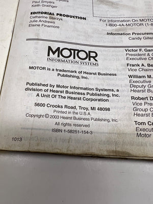 This Motor Specification Guide covers domestic and imported cars, light trucks, and vans produced between 1991-2003. Published by Motor Information Systems, a Hearst Business Publishing, Inc. division, in the USA, it offers detailed specifications and diagrams. Ideal for automotive professionals or collectors, this guide captures designs from over a decade of automotive history.