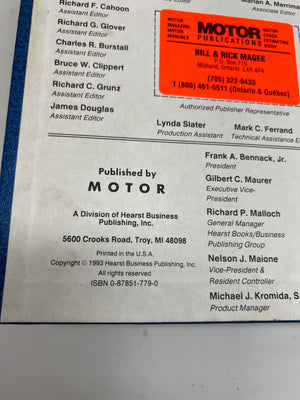 This 1992 Motor Wiring Diagram Manual includes detailed A/C and heater vacuum circuits for Chrysler Corporation and Ford Motor Company vehicles. Designed for professional use, it is a service trade edition published by Motor, a division of Hearst Business Publishing, in the USA. Diagrams include comprehensive wiring logic for full-size vans and Mustang models.