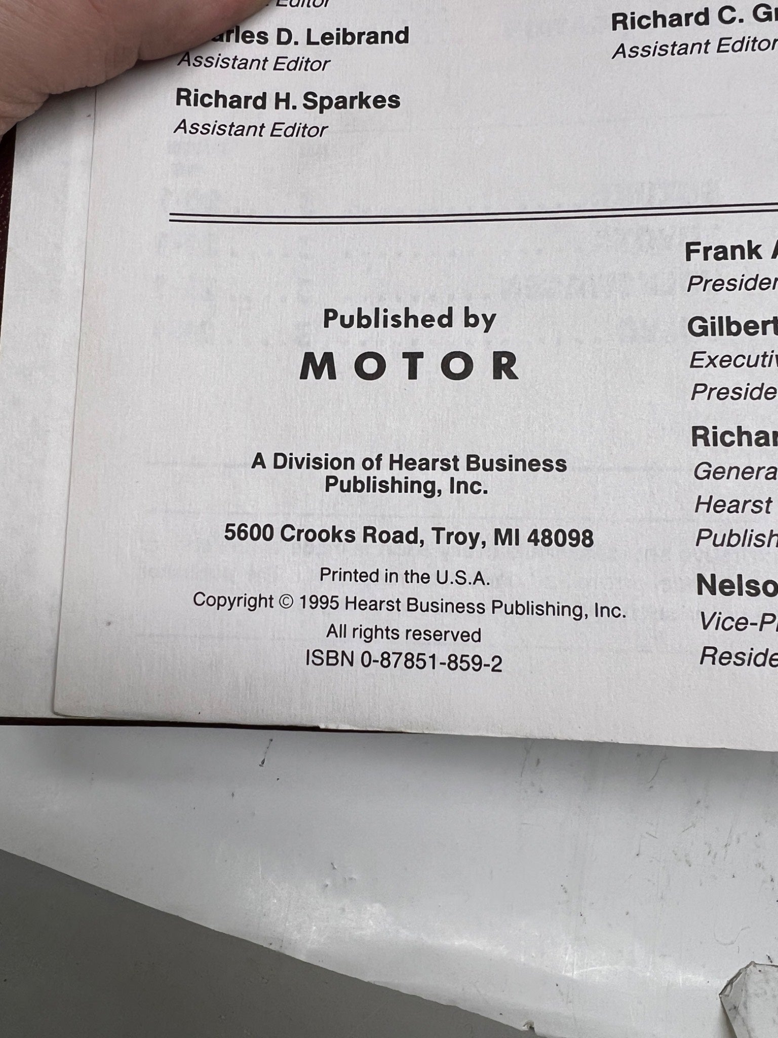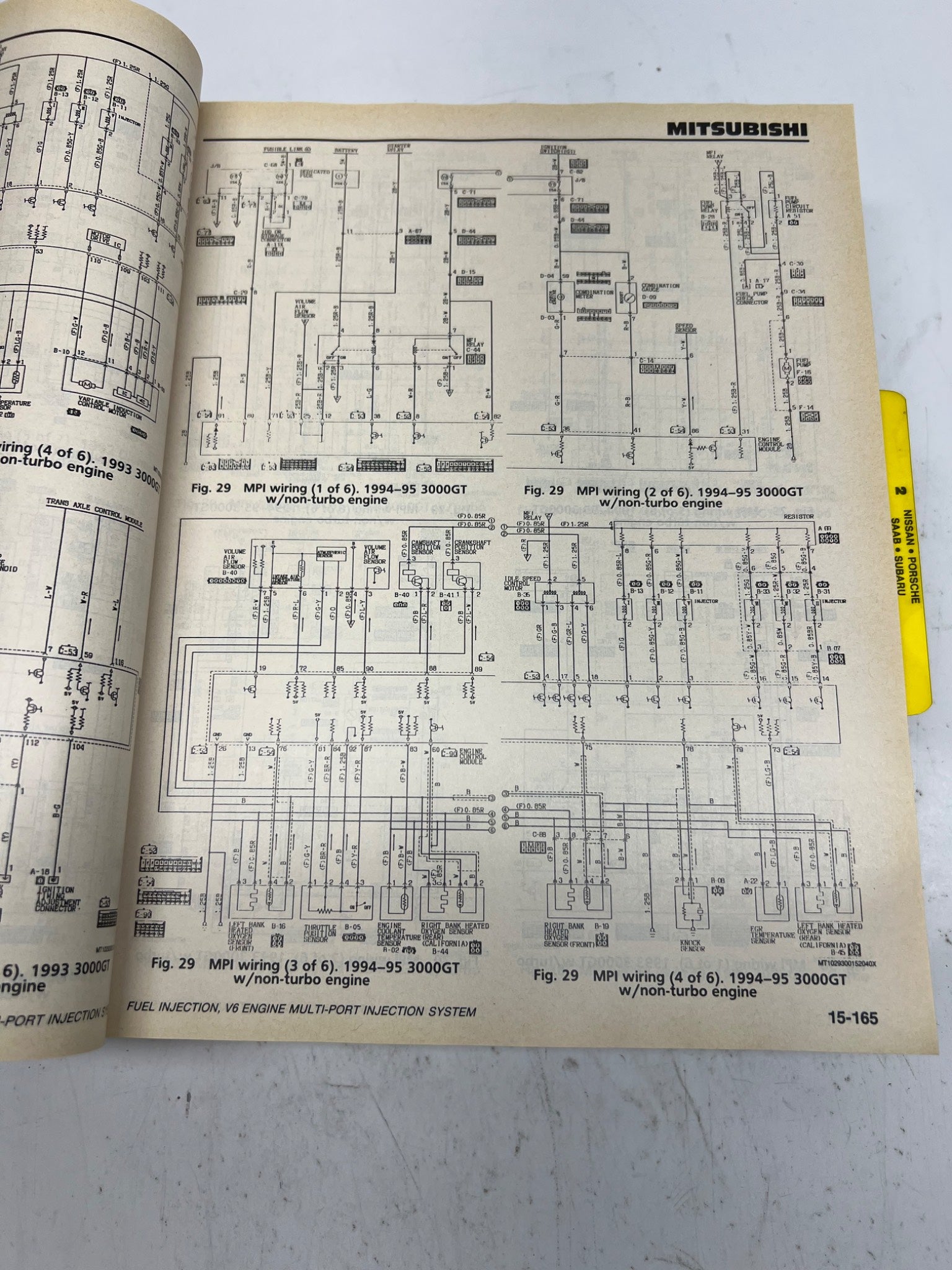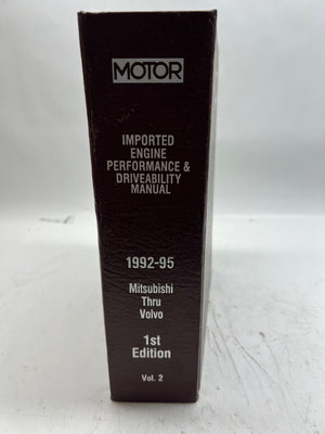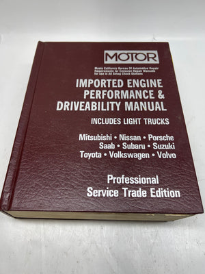 This 1995 Imported Engine Performance And Driveability Manual, published by MOTOR, is a first edition designed for professional service trade use. It covers advanced troubleshooting and engine performance specifications for a range of imports, including Mitsubishi, Nissan, Porsche, Saab, Subaru, Suzuki, Toyota, Volkswagen, and Volvo. Manufactured in the USA by Hearst Business Publishing, Inc.