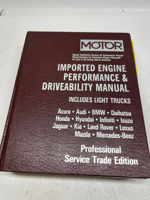 This 1995 Imported Engine Performance & Driveability Manual by MOTOR, Professional Service Trade Edition, provides comprehensive engine specifications and diagnostic charts for vehicles such as Acura, Audi, BMW, Lexus, and more, including light trucks. Published in the USA by Hearst Business Publishing, it includes detailed diagrams, troubleshooting trees, and system operation insights for professional automotive technicians.