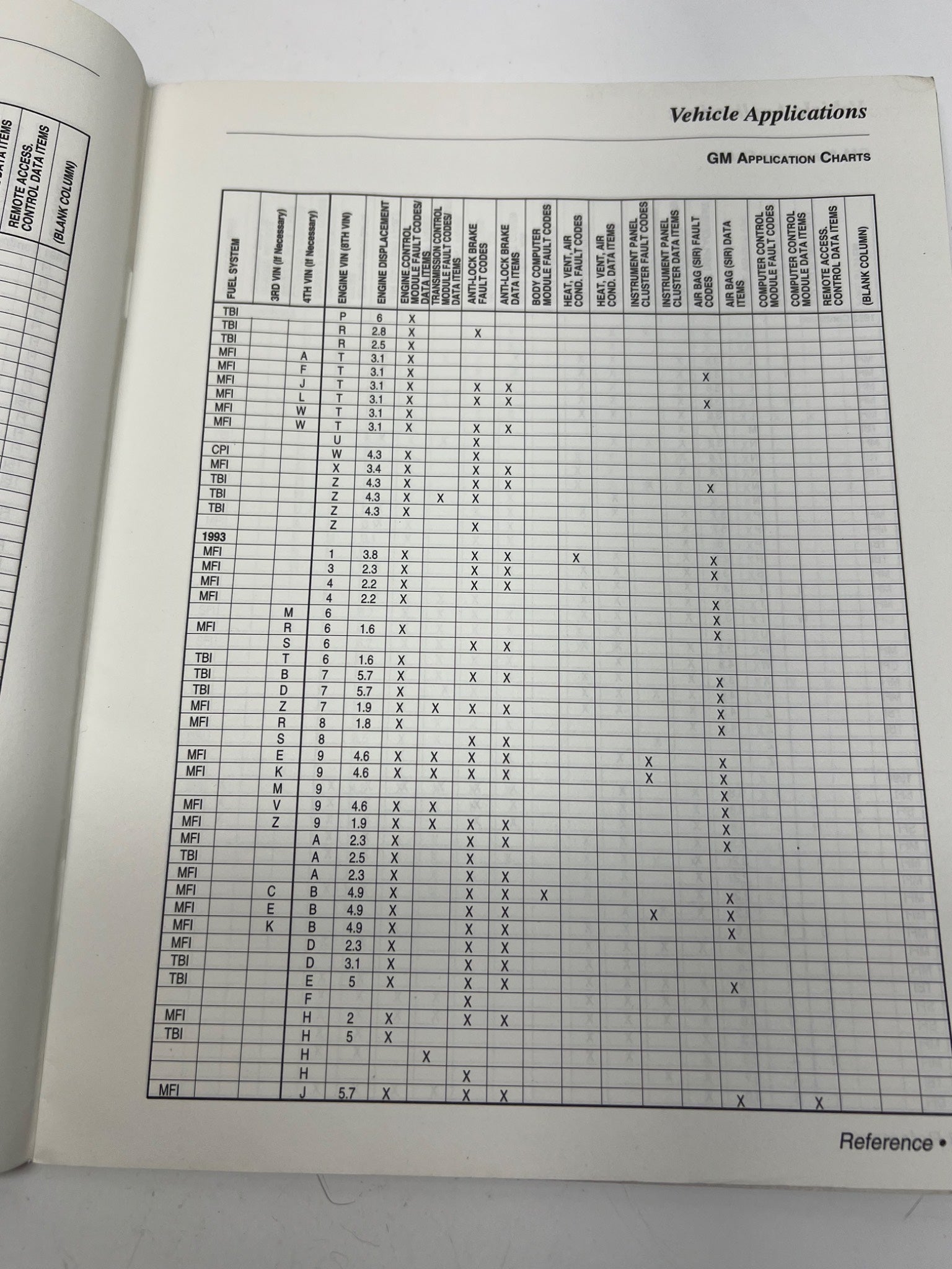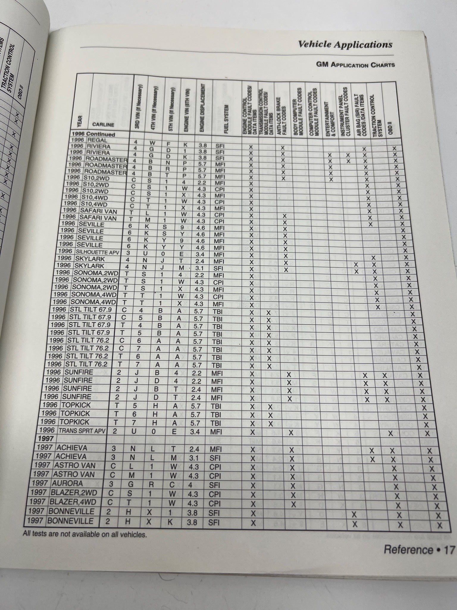 This 1997 OTC Domestic Pathfinder Vehicle Application Reference manual offers comprehensive tables and guides for vehicle diagnostic applications. Produced by OTC, a division of SPX Corp, and copyrighted in 1997, this manual is ideal for referencing vehicle diagnostics and applications for GM and other domestic models. Printed in the United States.