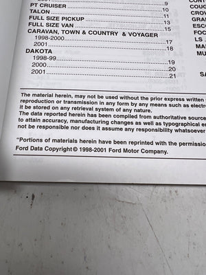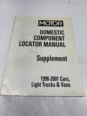 This Motor Domestic Component Locator Manual Supplement, manufactured in the USA, covers cars, light trucks, and vans from 1998 to 2001. It provides a comprehensive index of control modules and component locations for major models, including Dakota, Caravan, Town & Country, Cougar, and Catera. Published under Ford Motor Companyβs copyright, it is a valuable resource for accurate vehicle part referencing.
