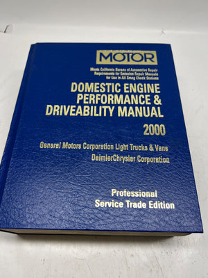 This is the 2000 edition of the 'Domestic Engine Performance & Driveability Manual' published by MOTOR, a division of Hearst Business Publishing, Inc. Printed in the USA, it focuses on General Motors light trucks and vans along with DaimlerChrysler vehicles. The professional service trade edition includes detailed diagrams and diagnostics for in-depth engine and system troubleshooting.