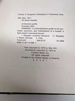 "All About Mopeds" by Max Alth, published in 1978, offers a comprehensive guide on mopeds, including operation, maintenance, and safety considerations. Printed in the United States by Franklin Watts, Inc., this book includes illustrations and practical details for enthusiasts or learners. A rare snapshot of moped culture during the late 20th century, the book retains all original content as per copyright.