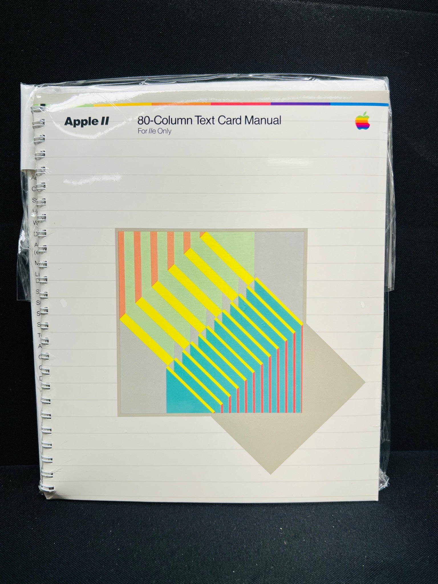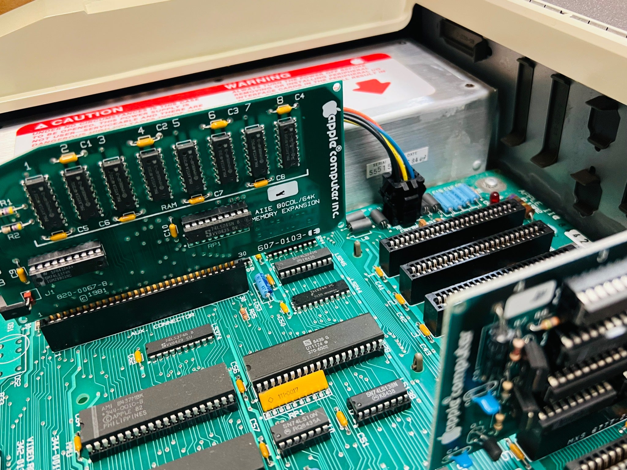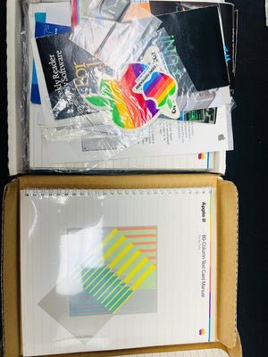 Apple IIc computer with accessories and manuals. Includes original keyboard, rear ports, internal circuitry view, power cords, peripheral cables, protective cover, and manuals such as the 80-Column Text Card Manual and Instruction Manual. Model number A2S4000, serial number A4522. Overall condition undetermined, with no specifics about functionality given.