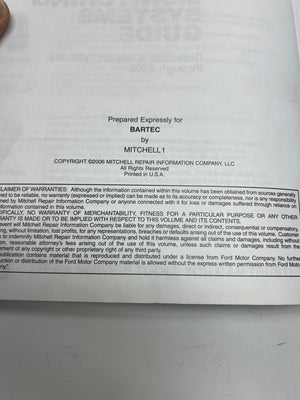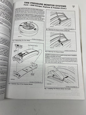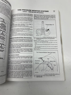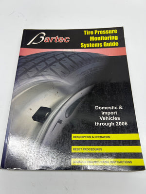 Bartec Tire Pressure Monitoring Systems Guide for domestic and import vehicles through 2006. This comprehensive guide includes descriptions, operation, reset procedures, and dismounting/mounting instructions for various makes and models. Published by Mitchell1 in 2006 and manufactured in the USA.