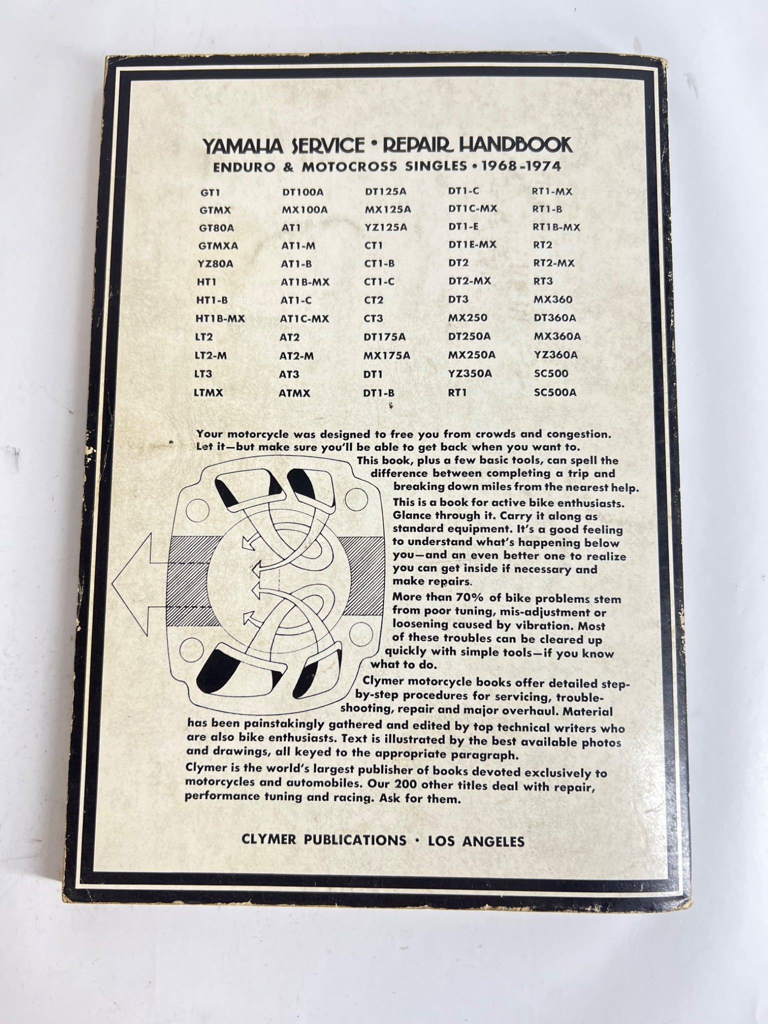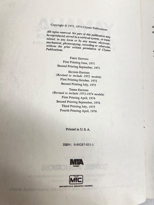 This Yamaha Service & Repair Handbook was published by Clymer Publications in the United States. Focused on Yamaha Enduro & Motocross Singles from 1968-1974, it provides detailed guidelines for maintenance and repair. Originally printed in 1971, this version is part of the fourth printing from April 1976. Complete with diagrams, technical illustrations, and step-by-step instructions, it showcases meticulous craftsmanship to assist enthusiasts.