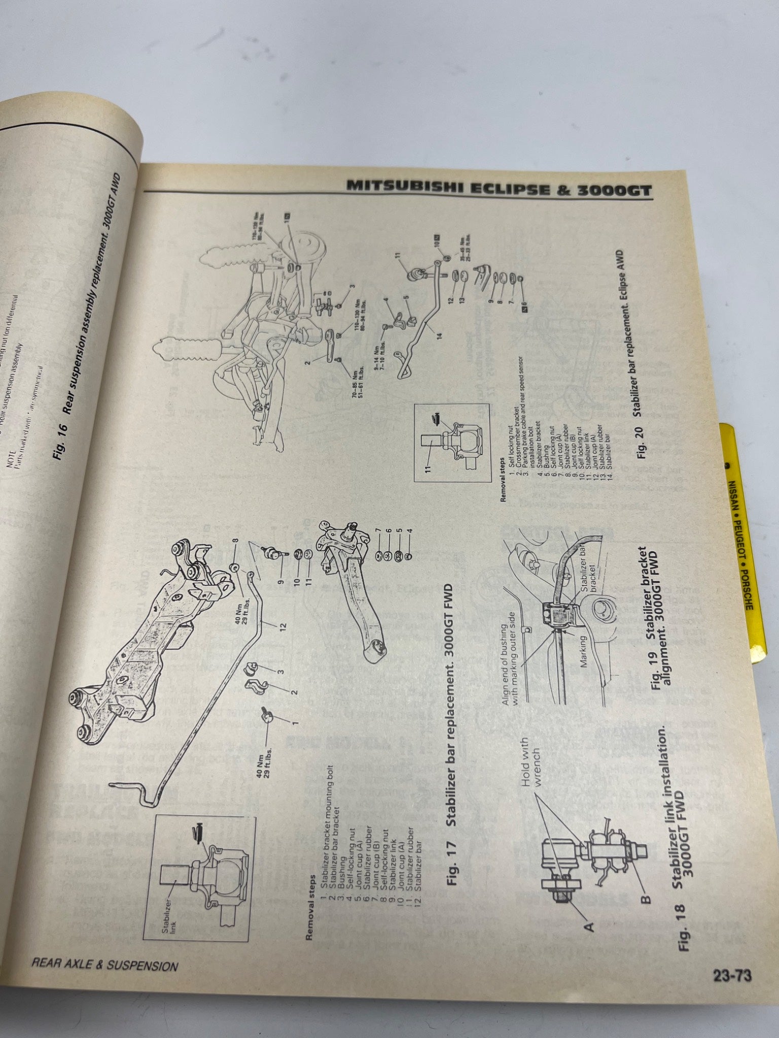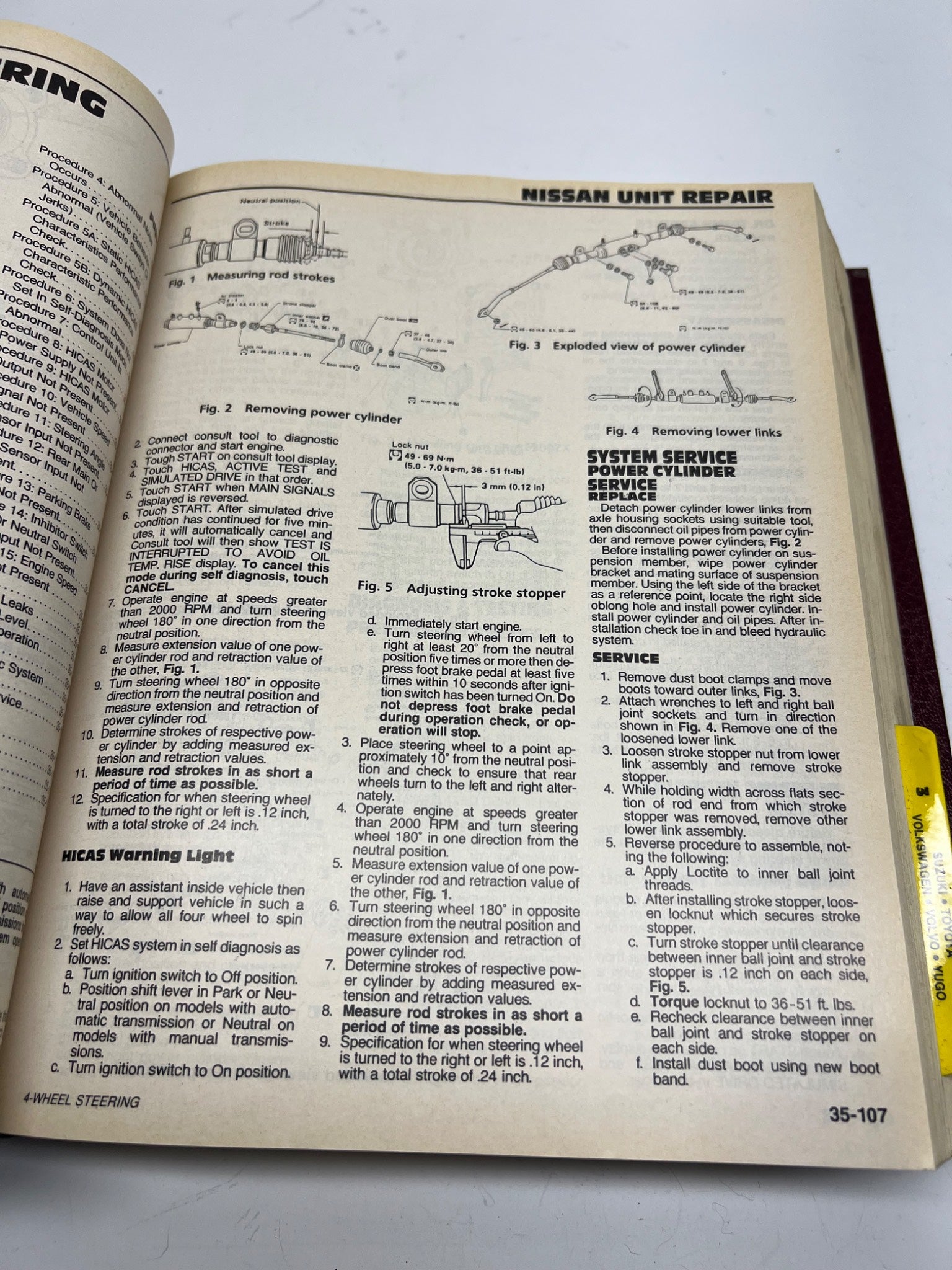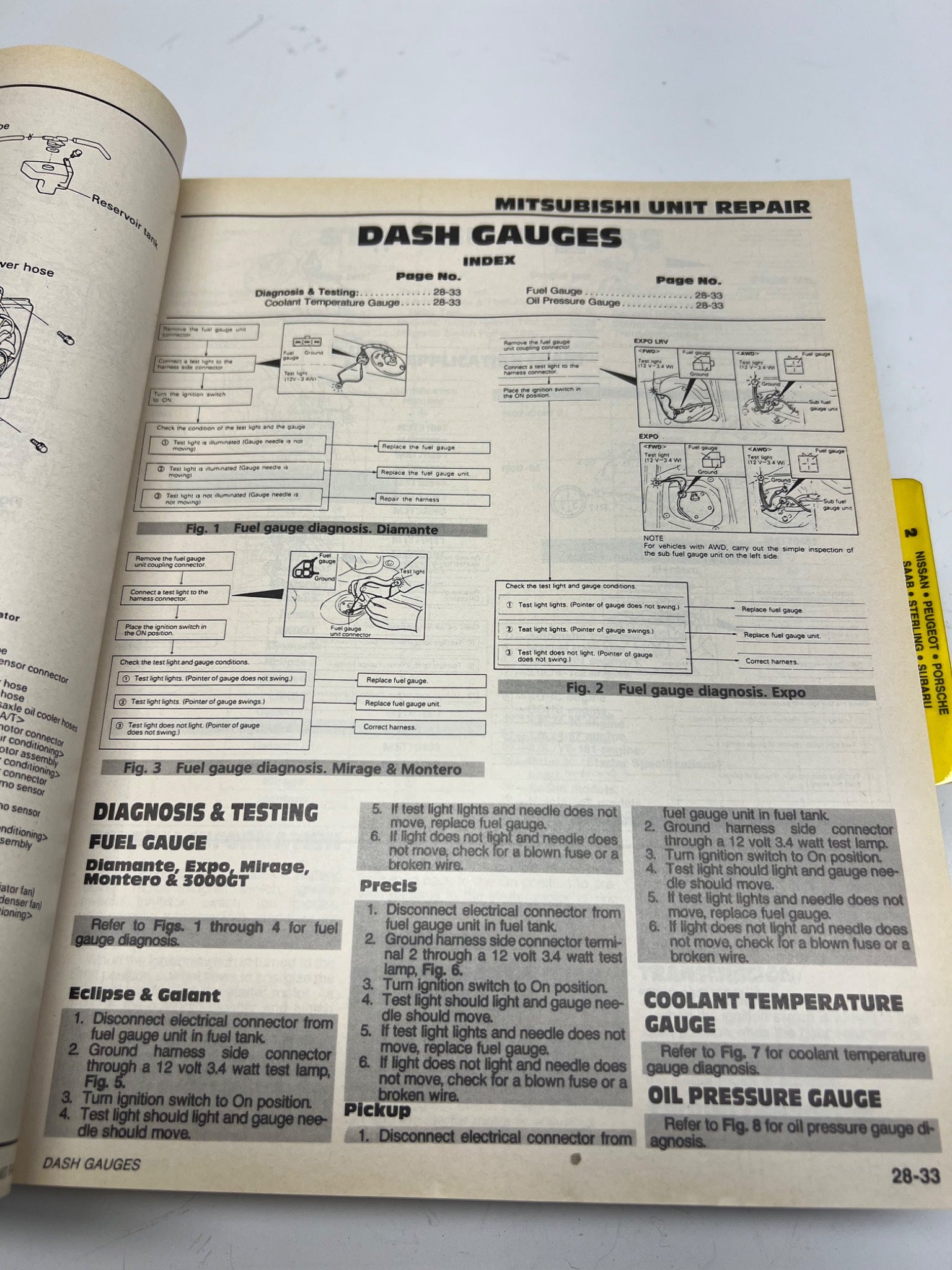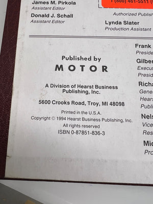 This is the 1994 Professional Service Trade Edition of the 'Motor Imported Car Repair Manual,' covering light trucks and cars from various manufacturers including Mitsubishi, Nissan, Toyota, Volkswagen, and more. Published in the USA by Hearst Business Publishing, it includes detailed repair instructions, illustrations, and diagnostic data. A comprehensive resource for automotive professionals and enthusiasts.