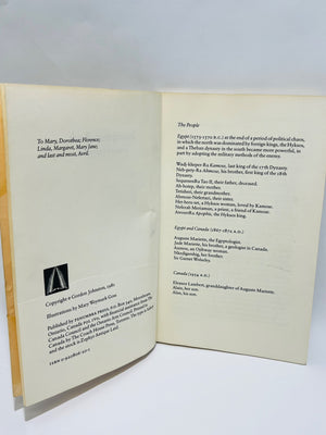 Softcover book titled 'Inscription Rock' by Gordon Johnston, published in 1975 by Applegarth Follies in the USA. The book's content revolves around themes and modes of storytelling spanning ancient cultures. The covers show discoloration, tape residue, and wear consistent with age. Features 60 pages of text and illustrations and includes a dedication in the initial pages.