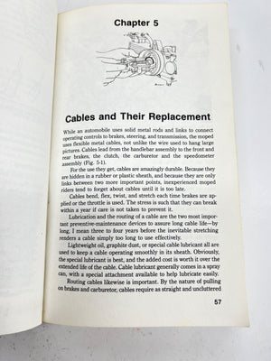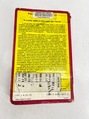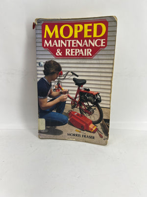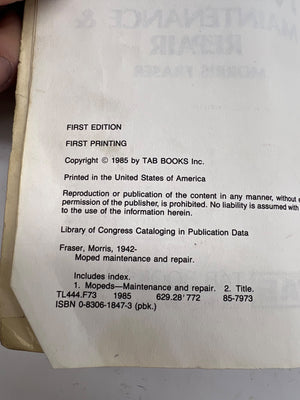 This first edition, first printing of 'Moped Maintenance & Repair' by Morris Fraser was published in 1985 by TAB BOOKS Inc. in the United States. The manual includes detailed guidance on maintaining and repairing mopeds, covering cables, drivetrain, and engine adjustment. It retains its original softcover with visible signs of use, suggesting its value as a hands-on resource. A practical manual from an era of increasing moped popularity.