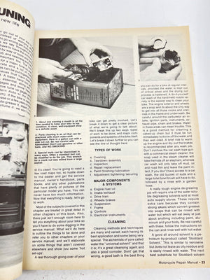 This Petersen's Motorcycle Repair Manual provides detailed guidance for 2-stroke and 4-stroke engine rebuilding, carburetor overhaul, and clutch and drivetrain care. Published in the United States, it includes comprehensive maintenance tips and visual aids for enthusiasts and mechanics. Its coverage of water-cooled M/C engines and tuning techniques reflects practical insights from its era.