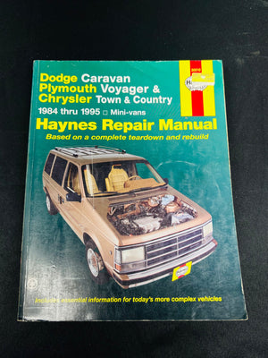 Haynes Repair Manual for Dodge Caravan, Plymouth Voyager, and Chrysler Town & Country mini-vans, covering model years 1984 through 1995. Includes step-by-step procedures for maintenance and repairs. Condition shows signs of use with slight wear on the cover but pages appear intact. Contains detailed diagrams and instructions for engines, transmissions, electrical systems, and more.