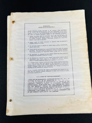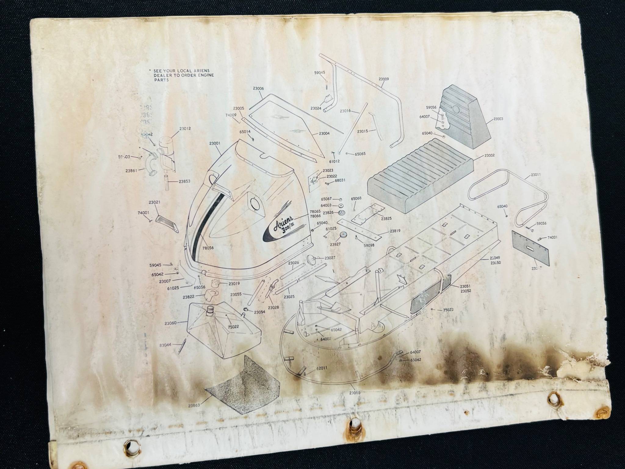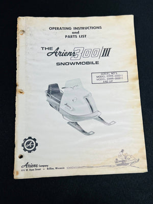Operating instructions and parts list for the Ariens 700 III snowmobile. Includes diagrams, part numbers, and maintenance guidelines. The item shows signs of aging, including discoloration, stains, and wear, particularly around the edges and binding holes. The manual is ideal for collectors or restoration enthusiasts seeking original documentation.
