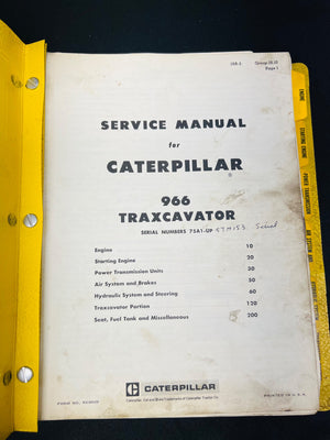 Original Caterpillar service manual for the 966 Traxcavator, covering serial numbers 75A1-up. Produced by the Caterpillar Tractor Co., Peoria, Illinois, USA. Includes detailed sections on the engine, steering, power transmission, hydraulic system, and various other components. The manual shows signs of age and use but remains intact and readable.